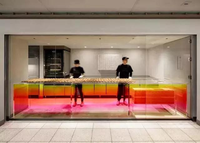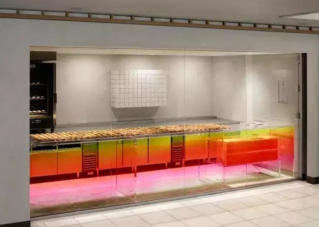 绚丽的灯光会丰富整个舞台的色彩,在 Bake Cheese Tart 北千住门店里,陈列台呈现半透明状,由黄绿到橙红色渐变,看着颇有舞台灯光的效果。