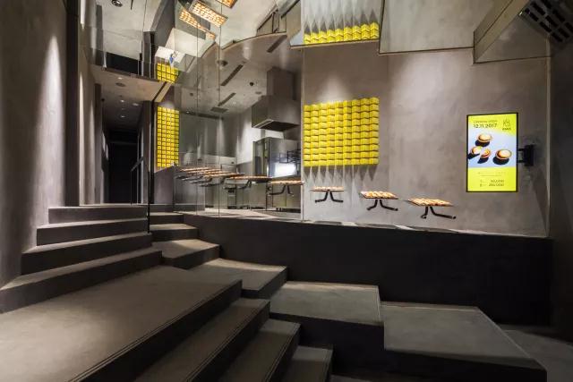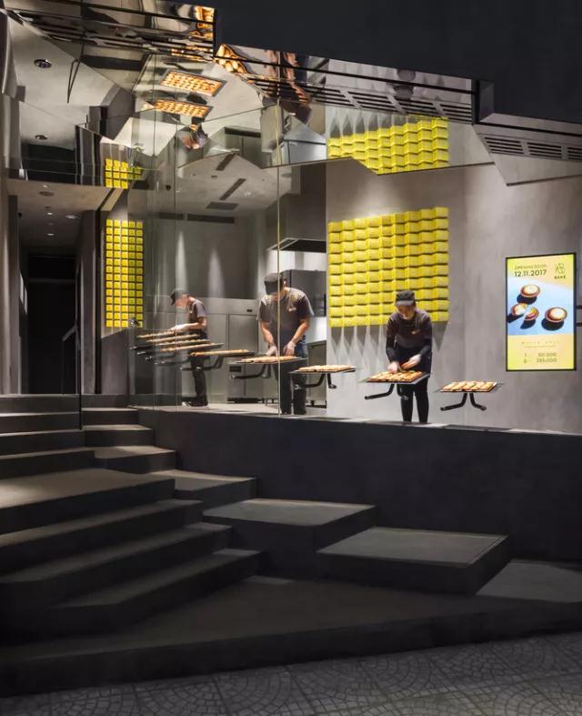 BAKE Cheese Tart 越南店的设计就考虑到了顾客的购买体验,为“观众”准备了一个便于观看的“观众席”。