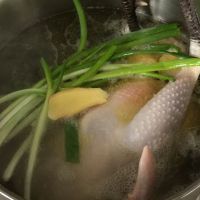3.将鸡放入大汤锅中,一次加入足量的水。葱姜也放进锅里。