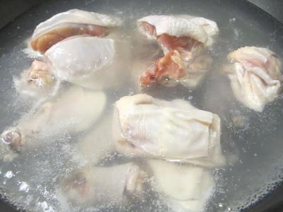 将切好块的土鸡肉以热水烫过去血水,并清洗乾淨。
