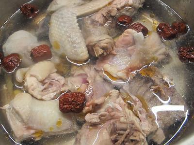 锅内放入薑片、麻油、米酒,并放入热水烫过的土鸡肉和红枣,加入1大碗的水和适量的盐,电锅外锅加入一杯水,压下开关至跳起即可。