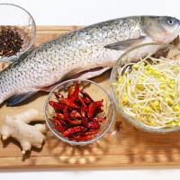 准备食材。草鱼一条、黄豆芽适量、干辣椒适量、花椒适量、姜一块。