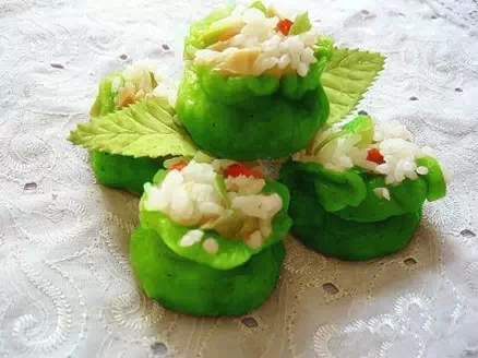 4)拌好的糯米包入面皮;收口,做成花瓶的形状;做好了上锅蒸十五分钟就可以了。