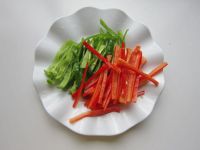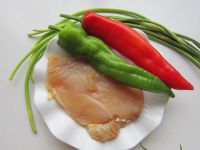 1.主料:蒜薹200克、鸡肉150克、青红辣椒各两个 辅料:植物油30克、盐8克、姜2克、生抽2克、淀粉5克、胡椒粉1克