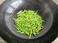 6.再次热锅凉油,油热8成下姜末蒜薹翻炒出香味